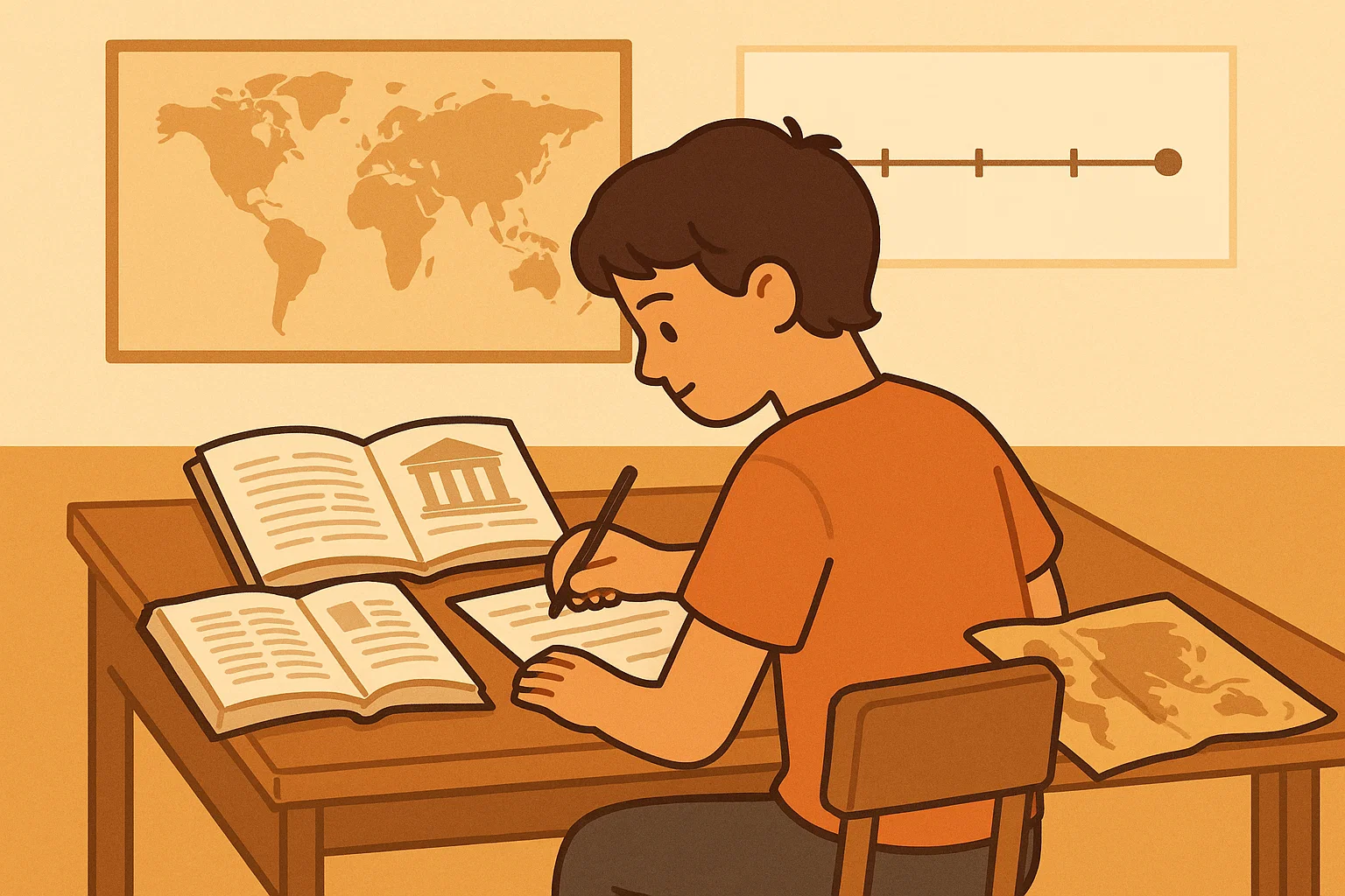 Después viene una búsqueda básica de información. No hace falta leer libros enteros. Basta con identificar fechas, lugares, personajes principales y qué ocurrió antes, durante y después del hecho. Esta información se anota de forma simple, como una lista.
